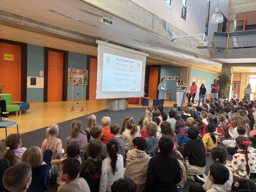 Am Mittwoch, den 12.11.2025, kam die gesamte Schulfamilie zur ersten Schulversammlung des Jahres zusammen. Nach dem gemeinsamen Singen der Schulhymne wurden die Pausen- und Spielregeln noch einmal wiederholt. Anschließend erklärte Frau Schnell die Neuerungen zu den Gut-Kärtchen. Zum Abschluss wurde bekannt gegeben, dass nach dem Bürgerentscheid, an dem auch alle Schülerinnen und Schüler teilgenommen hatten, die neue Boule- und Mölkky-Bahn eingerichtet wird.